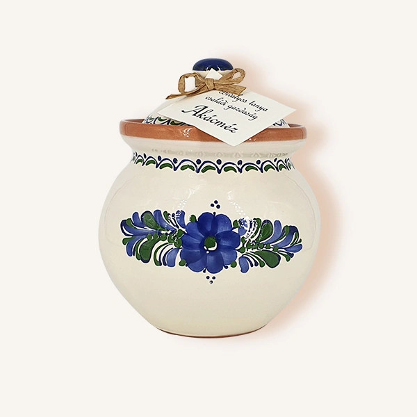 A méz hagyományos, kézzel készült kerámia csuporban érkezik, amelyet alföldi népi motívumok díszítenek.