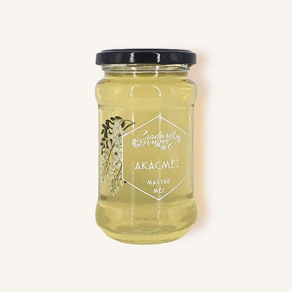 Világos, tiszta és bársonyos ízű magyar akácméz, amely hosszan folyékony marad.