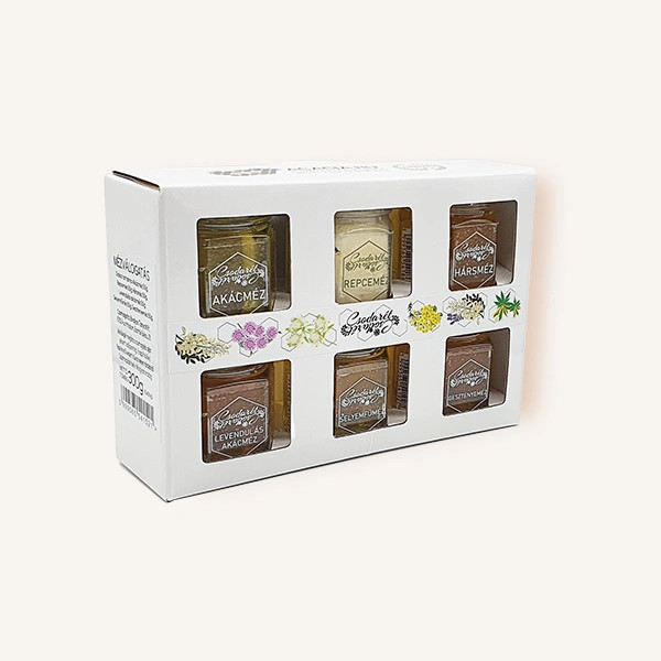 Ez az ízléses fehér kartondoboz hat különleges mézfajtát rejt, mindegyik 50 grammos kiszerelésben. A válogatásban megtalálható a világhírű akácméz, a krémes repceméz, az illatos hársméz, a karakteres gesztenyeméz, a ritkaságnak számító selyemfűméz, valamint a levendula ágyon érlelt akácméz.