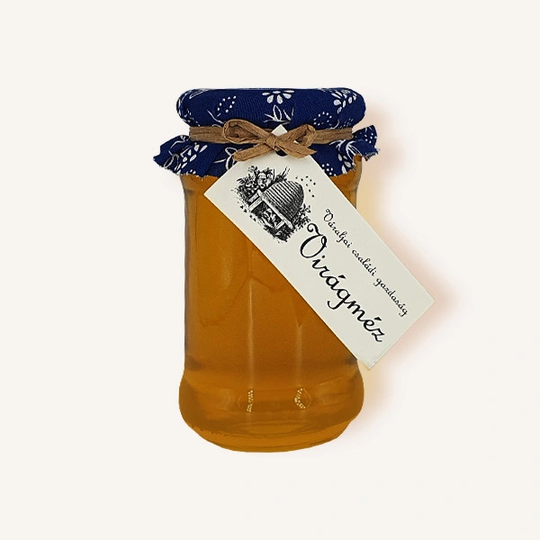Kiváló minőségű magyar vegyes virágméz, a természet ajándékához méltó kékfestő vászon csomagolással.